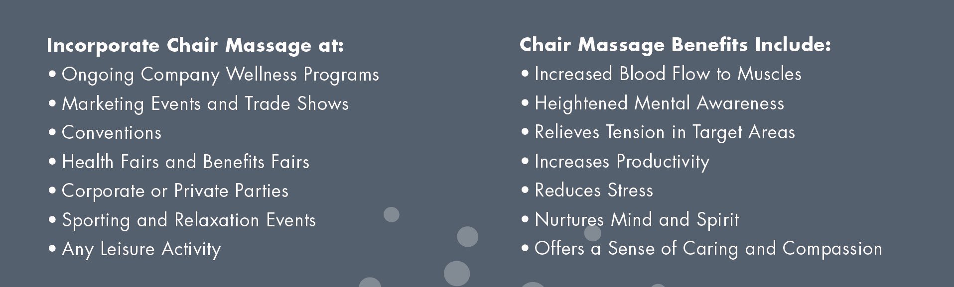 Additionally regular chair massage can alleviate employee aches and pains thereby reducing distractions that may inhibit productivity. Our licensed and fully credentialed professionals will deliver outstanding treatment leaving you feeling relaxed and recharged. It was heavenly i feel like mush. On site chair massage here is a summary of staff comments for our administrative professionals day massage event.